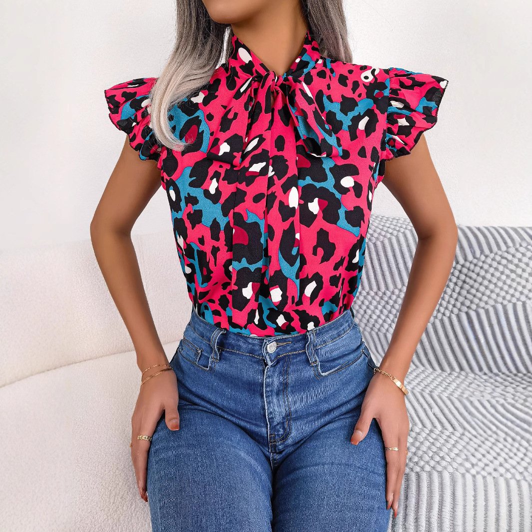 Be the first to review “Casual Leopard-Print Ruffle-Trim Lace-Up Chiffon Top”