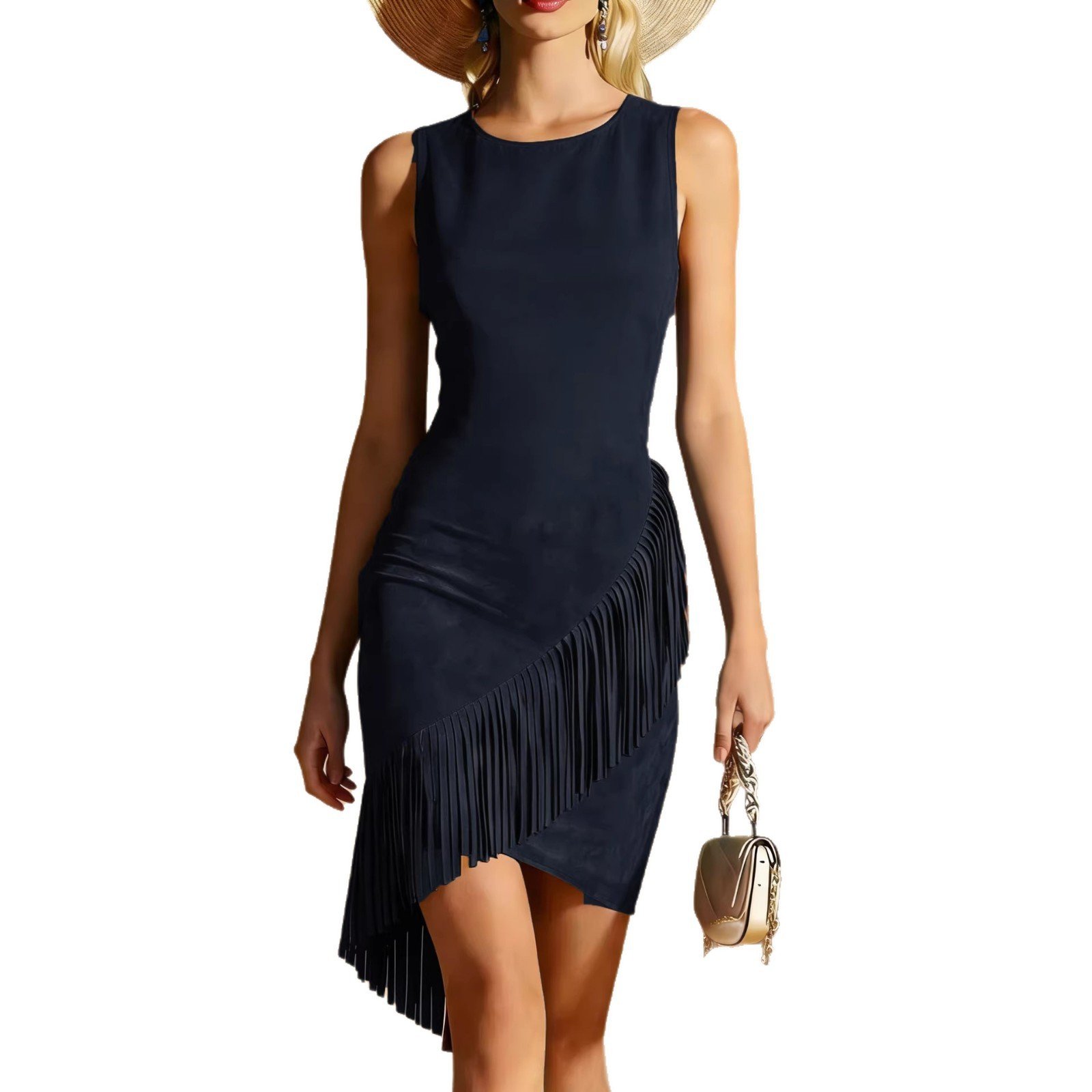 Western Wind Womens Summer Elegant Silk-Satin Texture Tasseled Hem Sleeveless Tank Dress