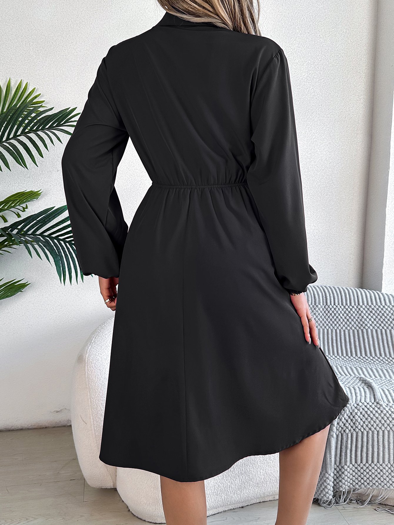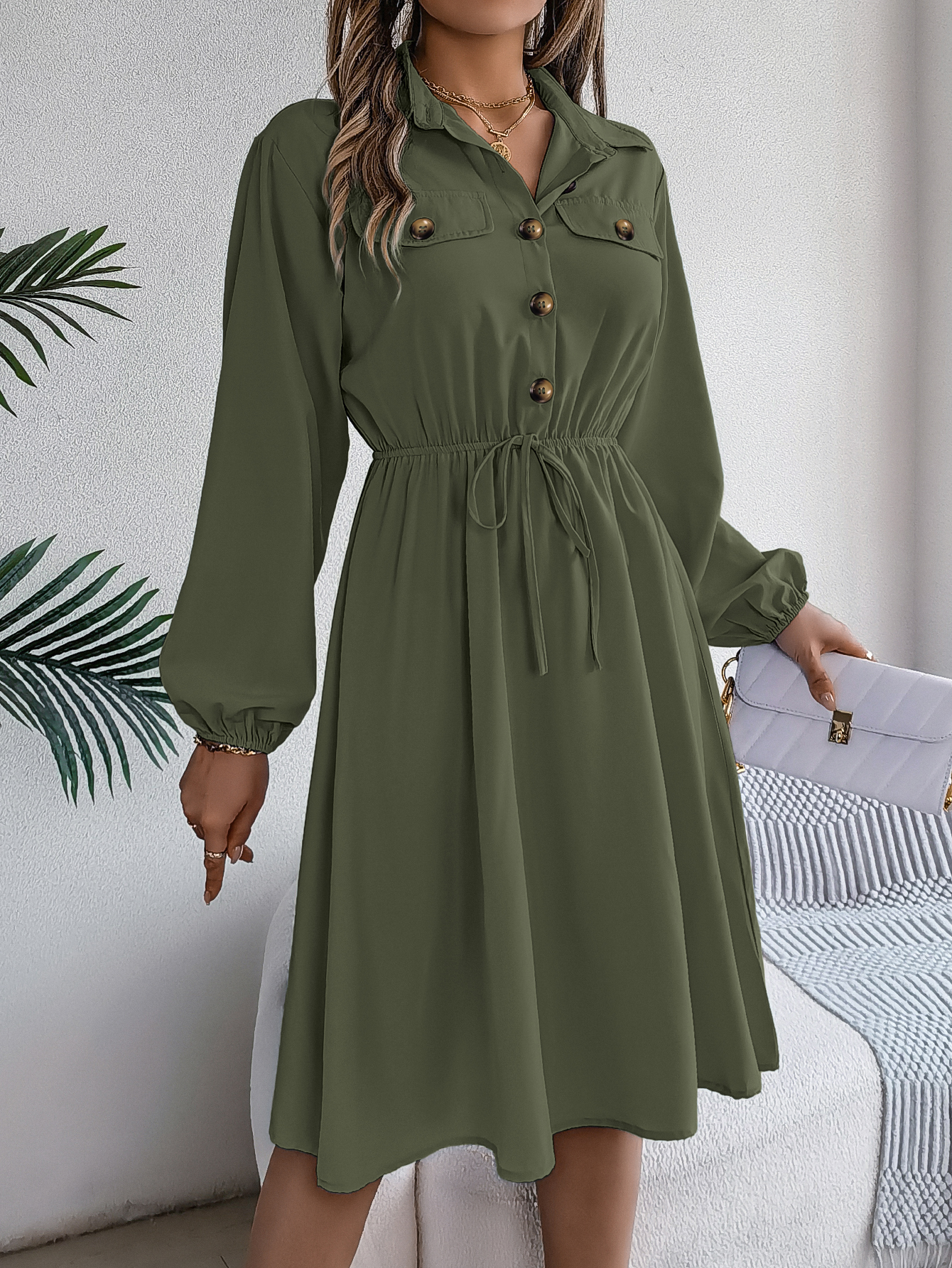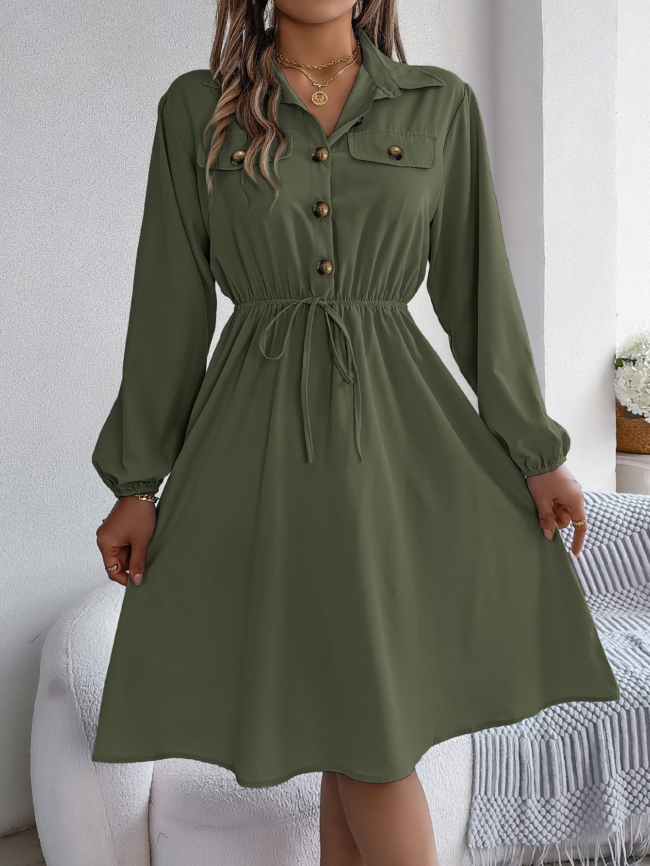 Women Casual Button Tie Waist Long Sleeve Shirt Dress