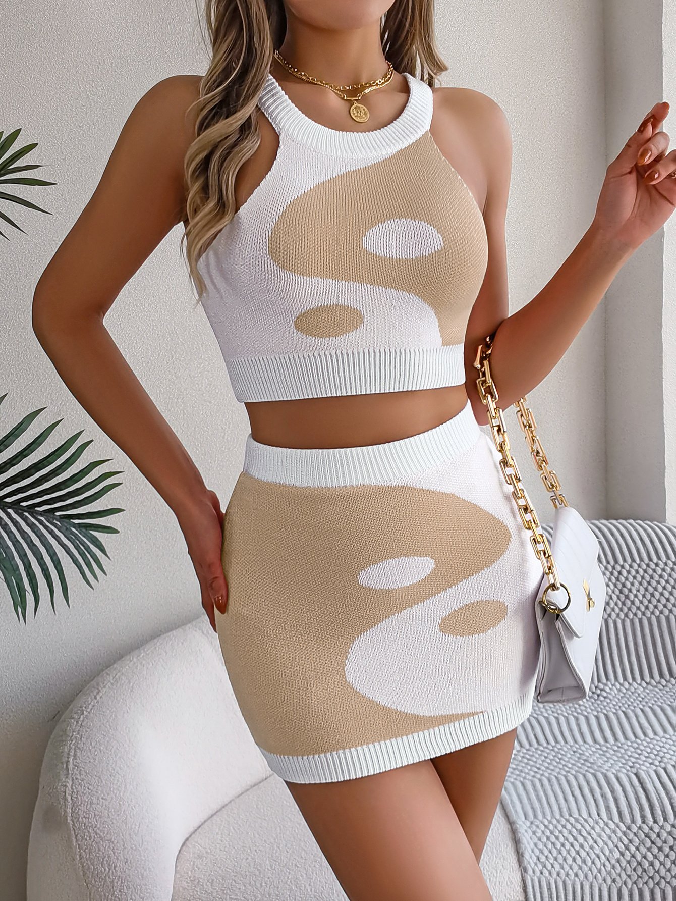 Women Color Block Cropped Top & Bodycon Skirt Knit Set