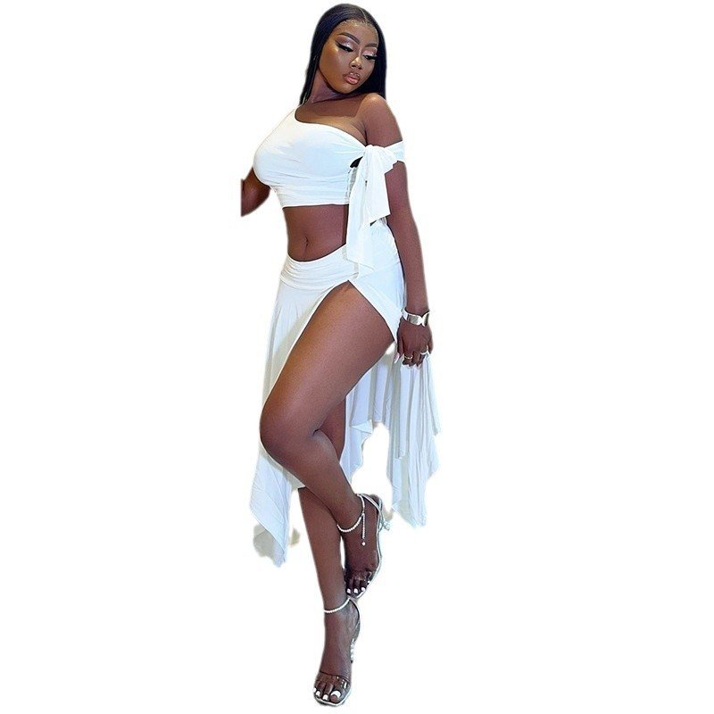 Womens Dress Set Sleeveless One-Shoulder Top With Flutter Sleeves And A Slit Skirt