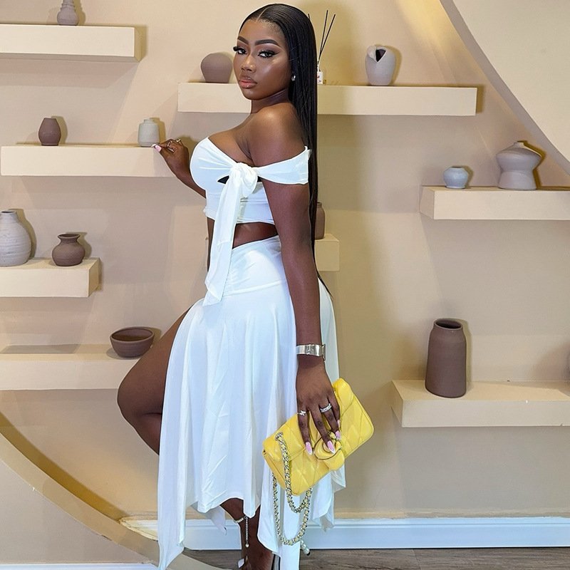 Be the first to review “Womens Dress Set Sleeveless One-Shoulder Top With Flutter Sleeves And A Slit Skirt”