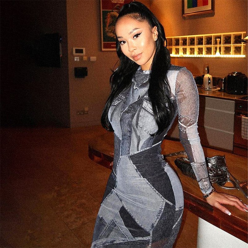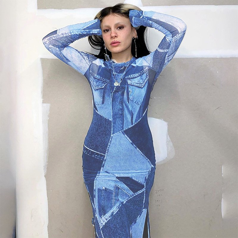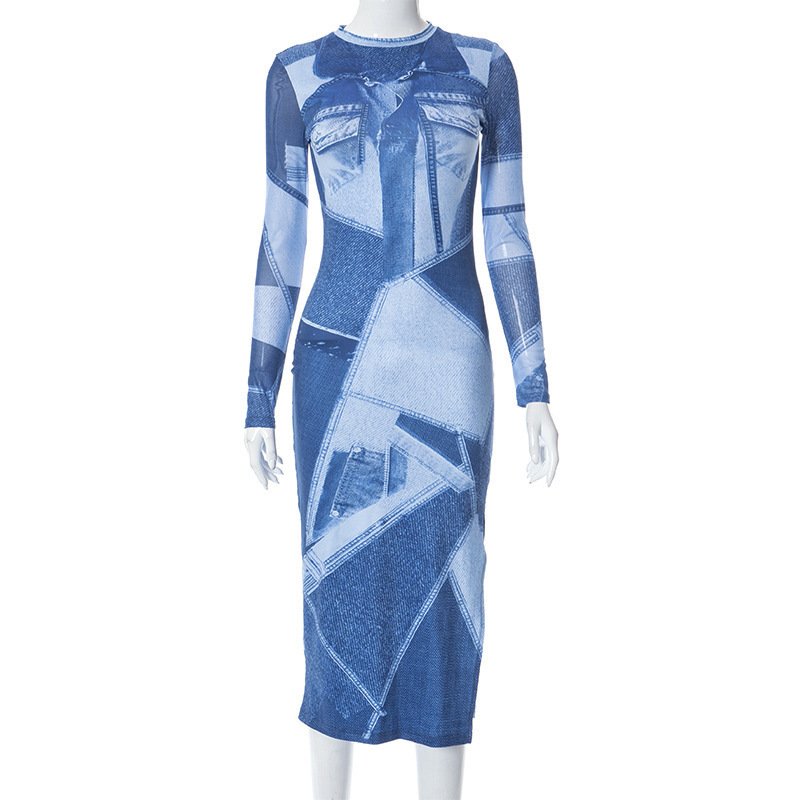 Women’s Fashion Casual Denim Printing Round Neck Long Sleeve Slim Dress